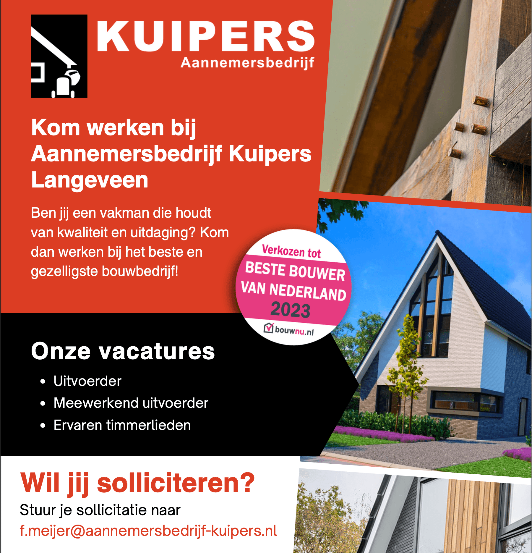 We kijken uit naar uw sollicitatie! Reageren kan middels een e-mail naar Fons Meijer, f.meijer@aannemersbedrijf-kuipers.nl